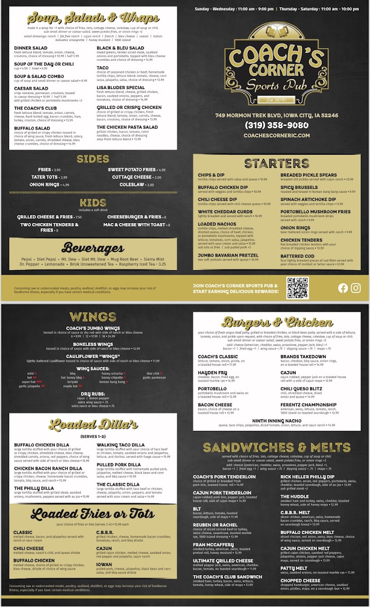 Welcome to Coaches Corner, the ultimate spot for food enthusiasts in Iowa City, located at 749 Mormon Trek Blvd. This dynamic menu offers something for everyone, from loaded fries and savory melts to mouthwatering sandwiches, perfect for sharing or indulging alone.